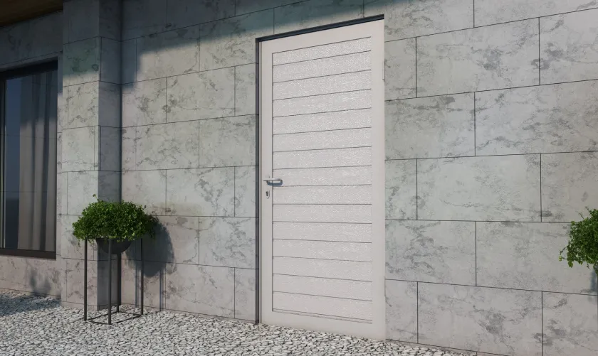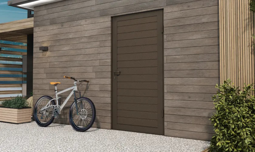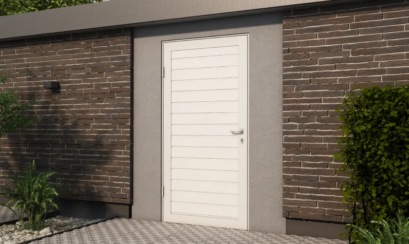 Боковые двери изготавливаются из тех же панелей, что и ворота. Благодаря этому они гармонично сочетаются между собой, а фасад гаража приобретает завершенный вид.