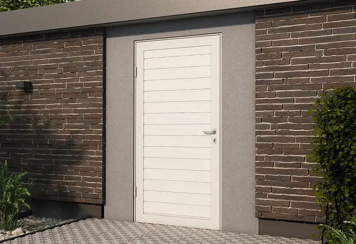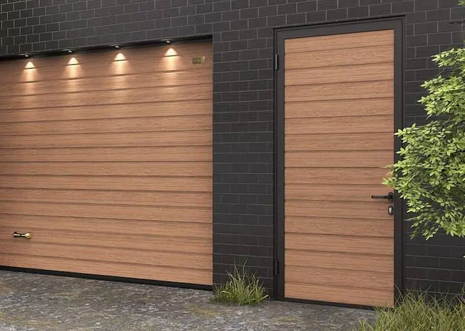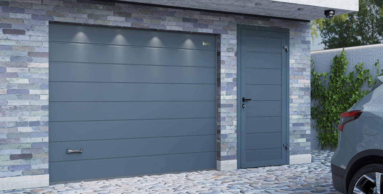 Создайте гармоничный тандем в экстерьере гаража. Для этого достаточно заказать боковую дверь в едином стиле с секционными воротами.